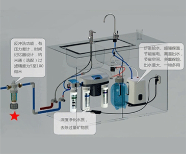 世??导矣脙羲?,一般是安裝在廚房的水池下面、放在水池邊的臺面上、有的如果不想在水槽上打孔掛的可以用龍頭吊片掛在墻壁上,凈水器一般以超濾和微滲透為主。